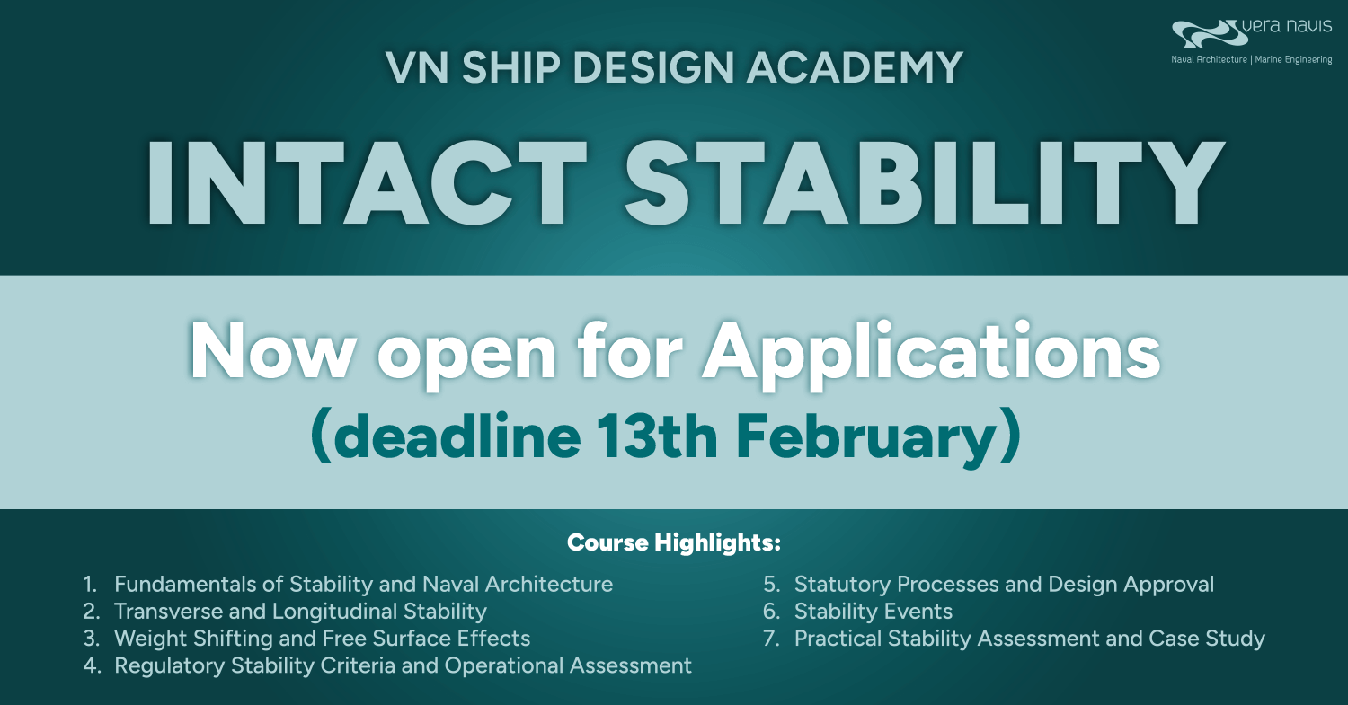 Interested individuals are invited to submit their applications by email to vn@veranavis.com by 13th February, including a short motivation paragraph and relevant personal details. Please use the subject line: “Application – VN Ship Design Academy: Intact Stability Course”